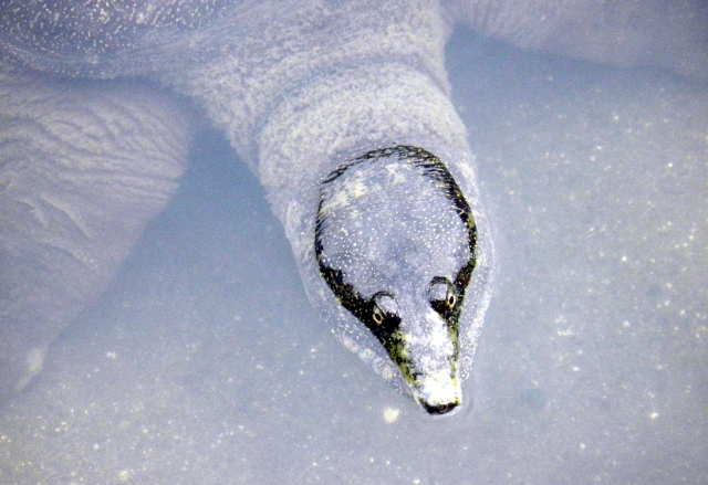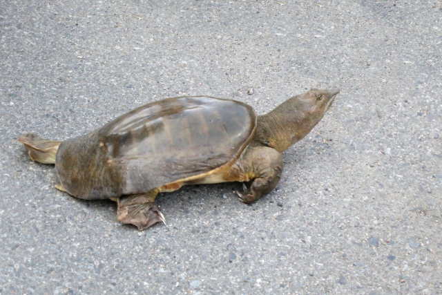 すっぽんの最大の特徴は、硬い甲羅ではなく、やわらかく平たい甲羅を持つこと。この体つきは泥に潜りやすく、水中で動きやすい形に進化したものと考えられています。長く、素早く伸ばせる首もすっぽんの特徴です。
